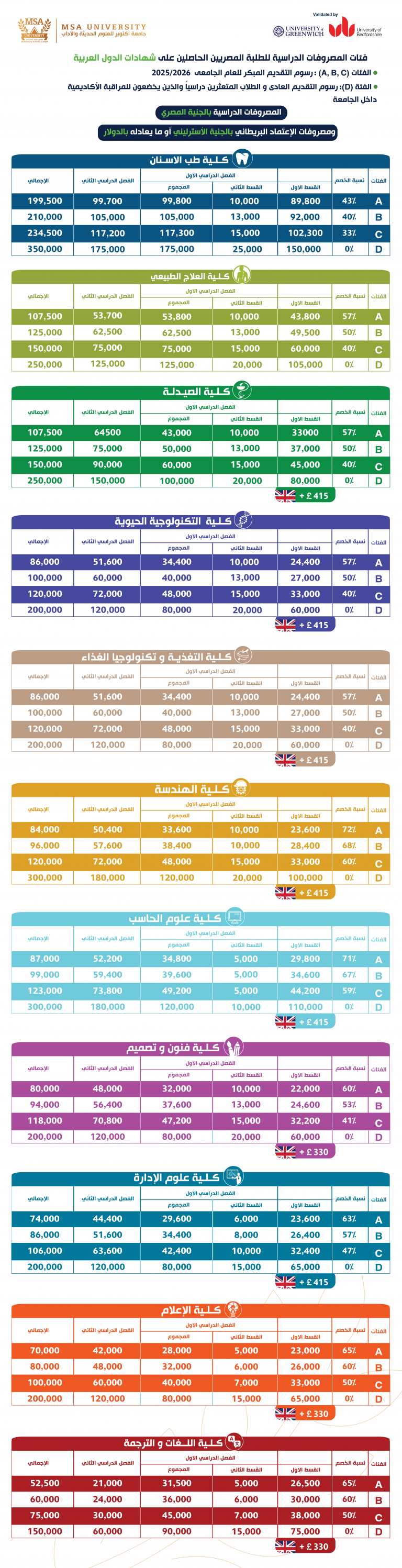- فئات المصروفات الدراسية سارية حتى سنة التخرج لجميع الطلاب المتقدمين الجدد والمحولين من الجامعات الأخرى الحكومية أو الخاصة