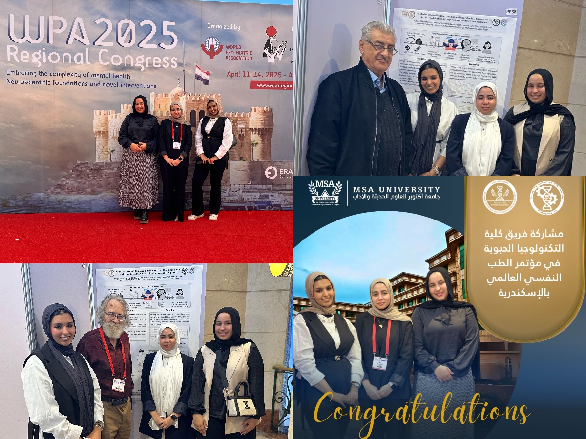 Malak Mahmoud, Mai Shehata, and Radwa Kamal — the team from the Faculty of Biotechnology at October University for Modern Sciences and Arts (MSA) — participated in the World Psychiatric Association (WPA) Conference held in Alexandria!