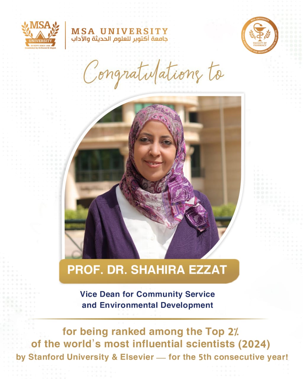 The Faculty of Pharmacy at October University for Modern Sciences and Arts (MSA) proudly extends its sincere congratulations to Prof. Dr. Shahira Ezzat – Vice Dean for Community Service and Environmental Development for- being selected—for the fifth consecutive year—among the …