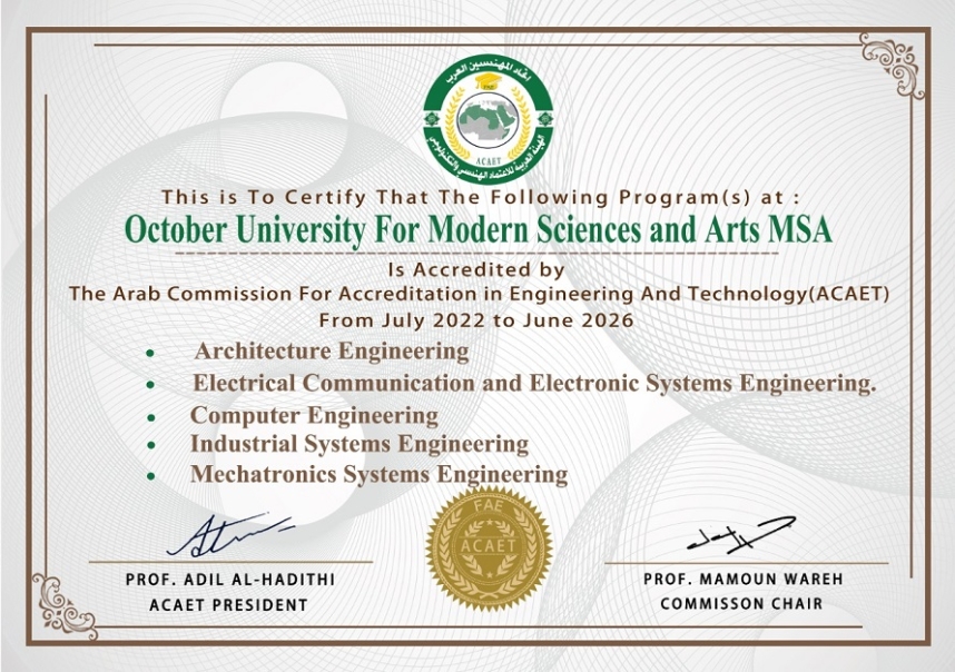 The Board of Trustees of October University for Modern Sciences and Arts – MSA University congratulates the Dean of the Faculty of Engineering, faculty members, students, and administrators for obtaining the accreditation certificate of the Federation of Arab Engineers (the …