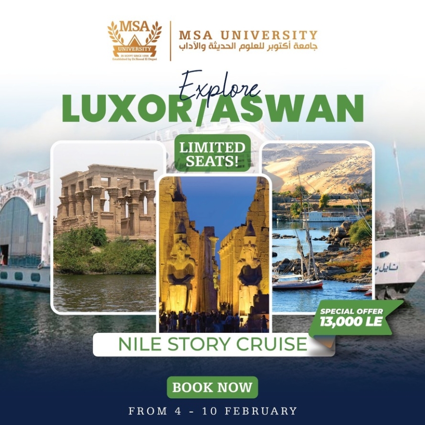 Last call for adventure, grab your chance before the deadline sets sail! MSA University is announcing the mid-year break to Luxor and Aswan on the “Nile Story” cruise from the 4th to the 10th of February, 2024 (4 nights/5 days), …