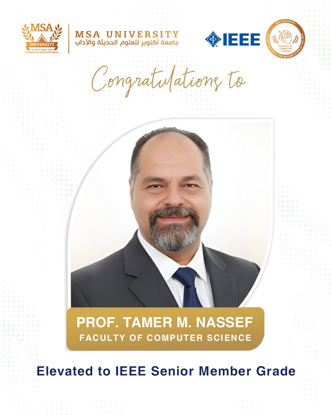 October University for Modern Sciences and Arts (MSA) and the Faculty of Computer Science are proud to announce the elevation of Prof. Tamer M. Nassef to the grade of Senior Member of the IEEE (Institute of Electrical and Electronics Engineers). …