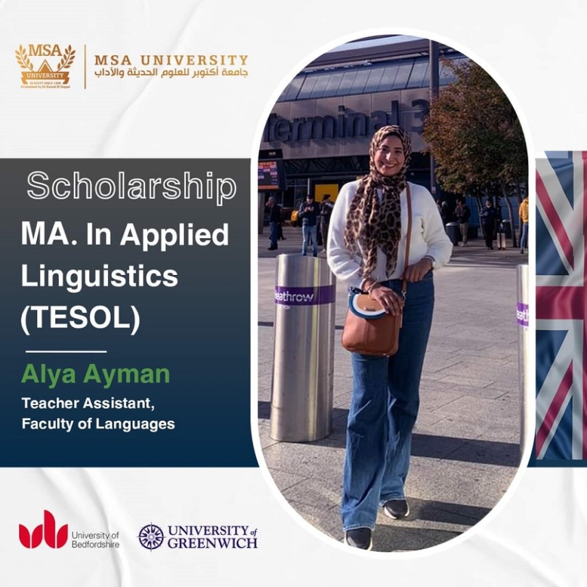 MSA Quality Assurance and International Partnerships Unit is glad to announce that Alyaa Ayman Teaching Assistant, Faculty of Languages has been granted a Scholarship to study her MA at the University of Bedfordshire. As soon as she landed at UK …