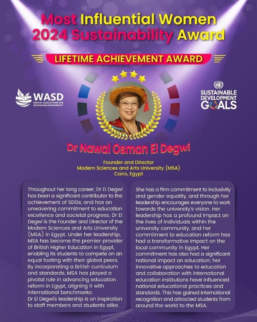 October University for Modern Sciences and Arts (MSA University) announces with great pride and joy that Prof. Dr. Nawal Osman El Degwi, The Head of Board of Trustees of MSA University, has been honored with the prestigious Lifetime Achievement Award at the Most Influential Women 2024 Sustainability Awards.