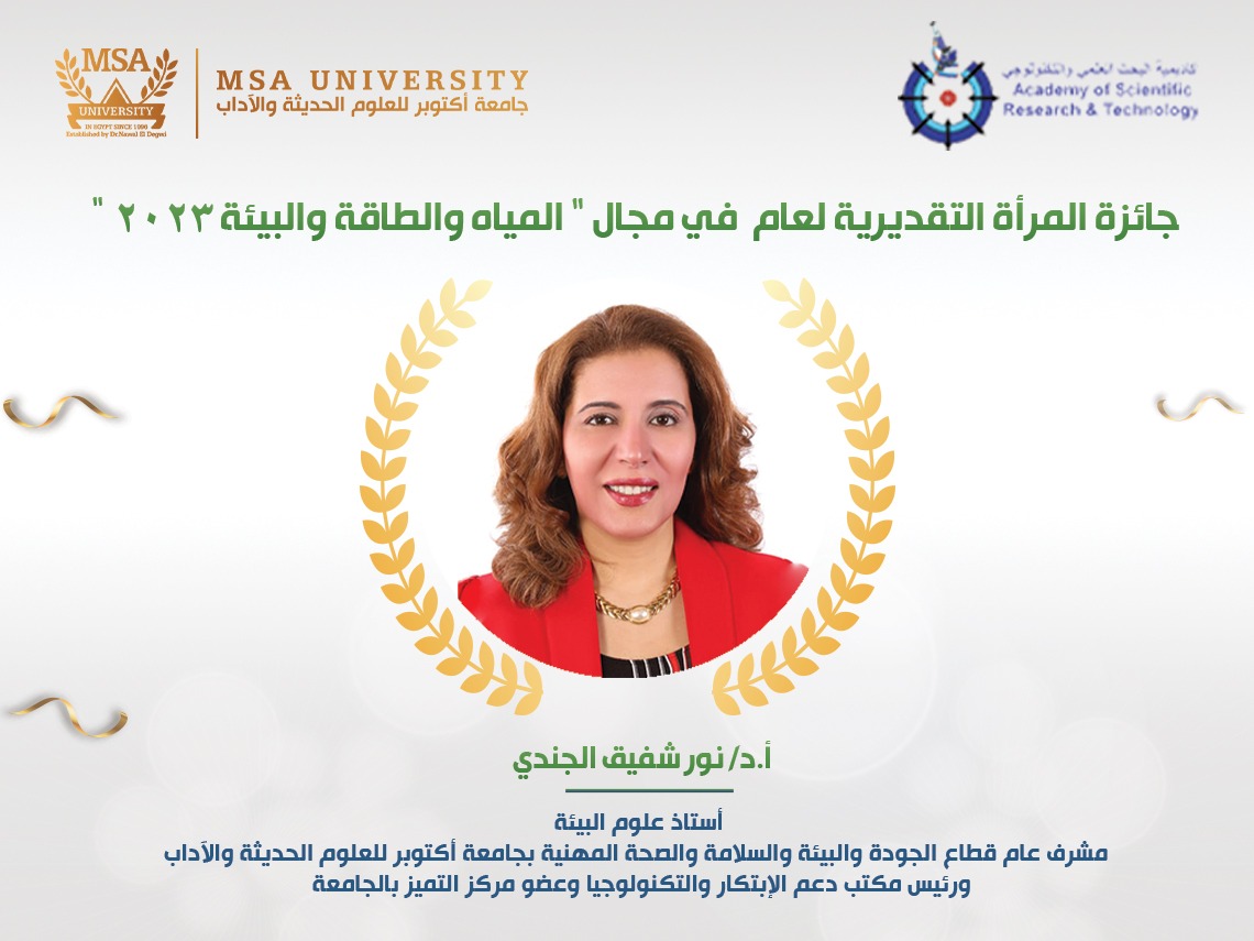 Dr. Nour Shafik El-Gendy, Professor of Environmental Sciences, General Supervisor of the Quality, Environment, Safety, and Occupational Health Sector, Head of the Innovation and Technology Support Office, and Member of the Center of Excellence at October University for Modern Sciences and Arts (MSA University), has been awarded the Prestigious Women’s Award for 2023 in the field of “Water, Energy, and Environment.”
