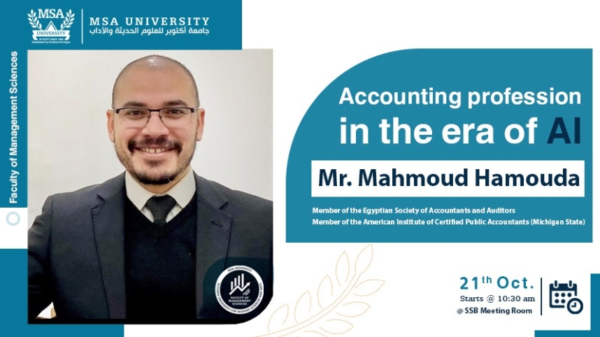 The Faculty of Management Sciences at October University for Modern Sciences and Arts (MSA University) is excited to present an upcoming session led by “Mr. Mahmoud Hamouda,” a member of the Egyptian Society of Accountants and Auditors, and an American Institute of Certified Public Accountants (Michigan State) member.