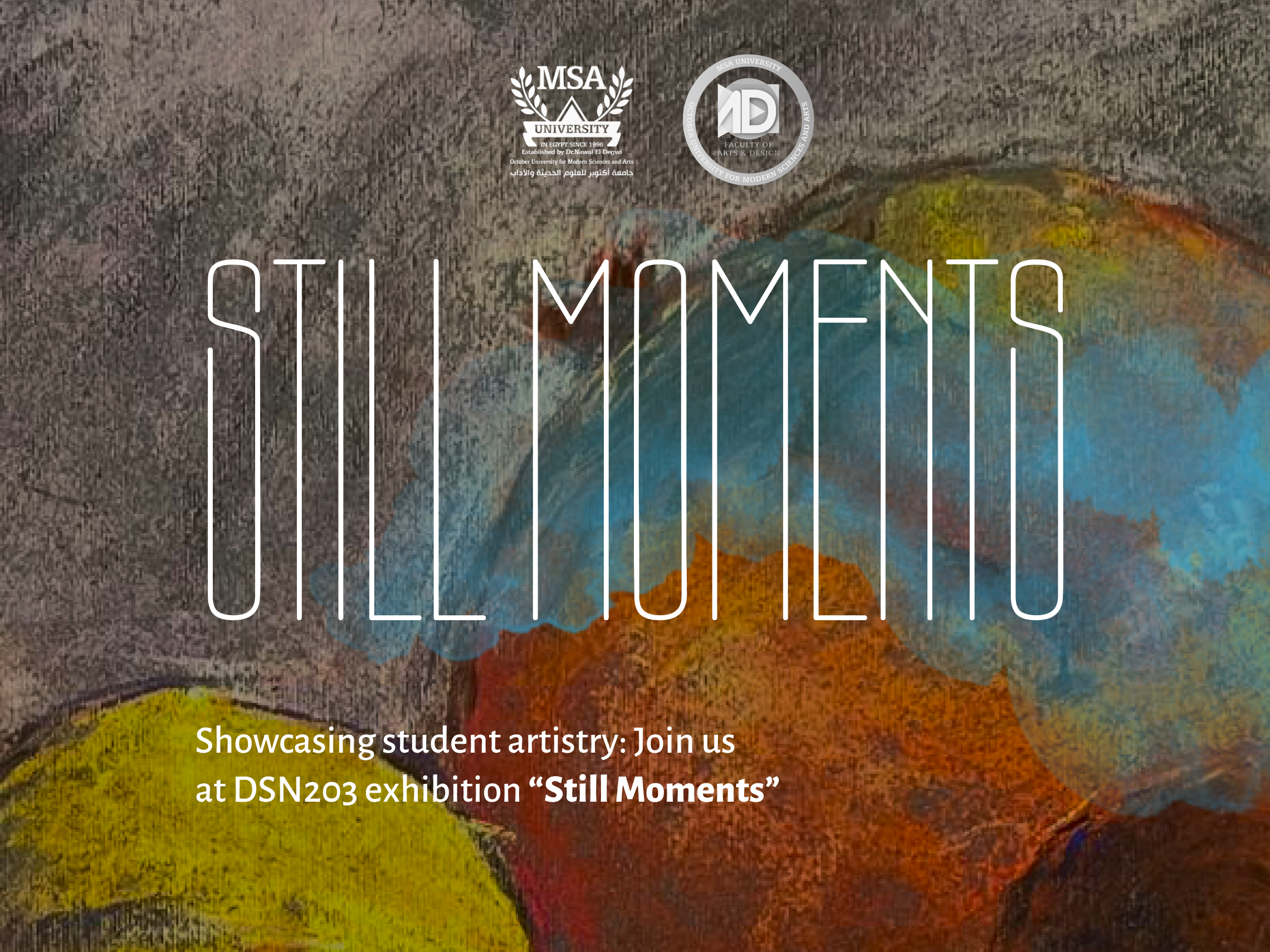 The Faculty of Arts and Design at October University for Modern Sciences and Arts (MSA) proudly presents the Advanced Painting Exhibition, showcasing a vibrant selection of student works from the Advanced Painting course, which will be officially opened by Prof. Dr. Tarek Saleh Said, Dean of the Faculty of Arts and Design.