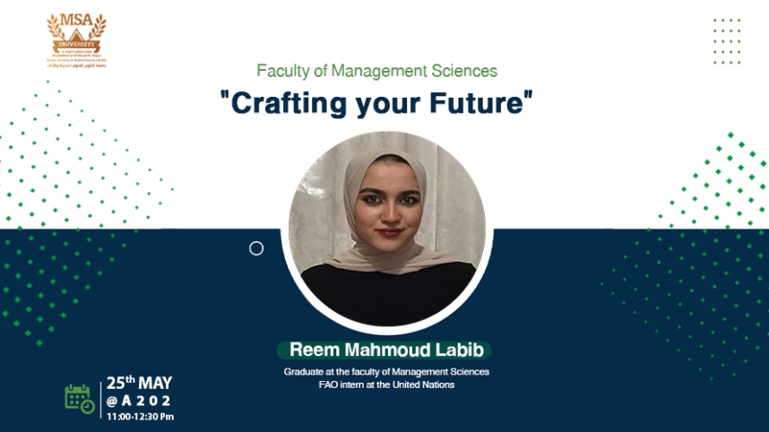 The Faculty of Management Sciences at October University for Modern Sciences and Arts (MSA University) invites students to attend a session entitled “Crafting Your Future” by one of our Faculty’s graduates Ms Reem Mahmoud Labib, a Graduate of the MSA Management Sciences Department of Economics; Class of 2019.