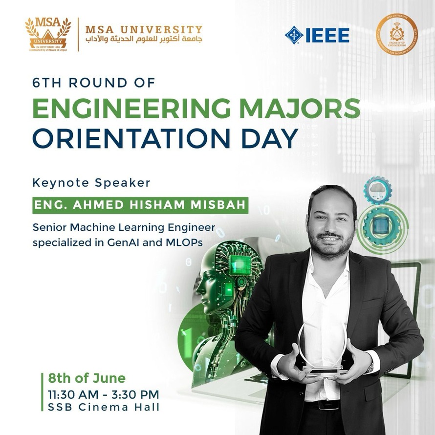 We are thrilled to announce our keynote speaker, Eng. Ahmed Hisham Misbah, a Senior Machine Learning Engineer specializing in GenAI and MLOps. This is a fantastic opportunity for MSA GSE Engineering students on the brink of declaring your majors.