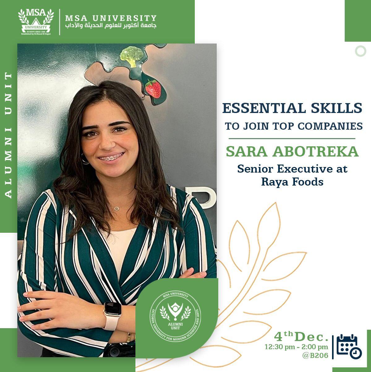 As part of the ongoing collaboration between October University for Modern Sciences and Arts (MSA) and Raya Foods, the MSA Alumni Unit is organizing a special lecture, titled “Essential Skills to Join Top Companies,” featuring MSA alumna Sara Abotreka, Talent Management Senior Executive at Raya Foods to empowering our students and alumni with the tools they need to succeed.