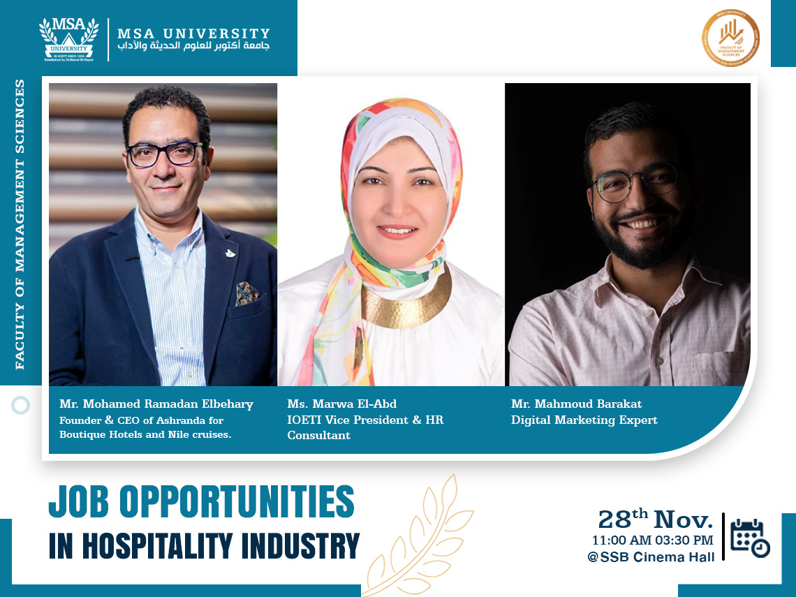 The Faculty of Management Sciences at October University for Modern Sciences and Arts (MSA) cordially invites you to an event entitled “Job Opportunities in Hospitality Industry” featuring three distinguished speakers Mohammed Ramadan Behairy, Marwa El-Abd and Mahmoud Barakat.