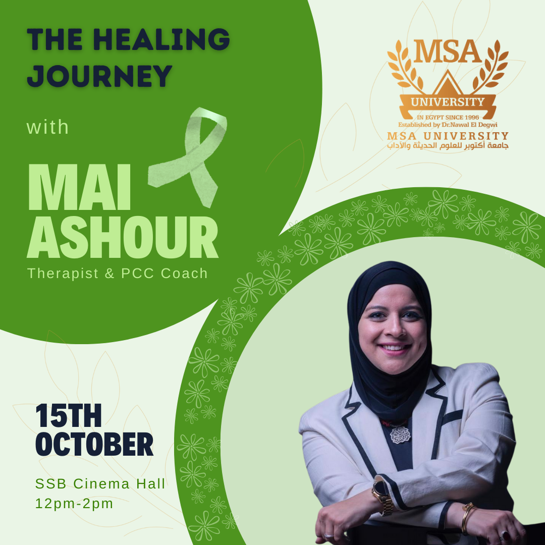 At October University For Modern Sciences And Arts (MSA) University, we believe in the importance of mental well-being as a key component of a fulfilling and successful life. That’s why we’re excited to invite all students and staff to an exclusive event focused on mental health—”The Healing Journey”—presented by Dr. Mai Ashour.