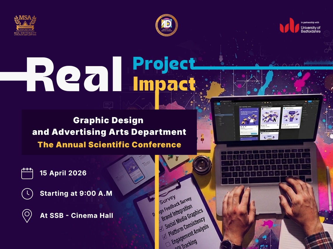 The Faculty of Arts and Design at October University for Modern Sciences and Arts (MSA) is conducting its annual scientific conference of the Graphic Arts and Advertising Department, in a distinguished edition entitled “Real Project – Real Impact” under the patronage of Prof. Dr. Tarek Saleh, Dean of the Faculty of Arts and Design and Prof. Dr. Hani El-Saeed.