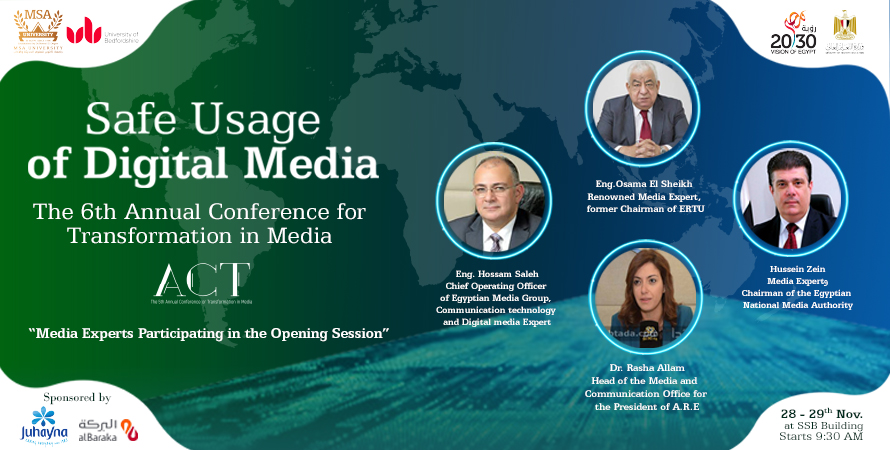 In the light of Egypt’s 2030 developmental plan, MSA’s Faculty of Mass Communication is launching its 6th Annual conference for Transformation in Media “ACT” under the title of “Safe Usage of Digital Media: Ethics and Legislations” with a grand opening session featuring ministers and media figures within a two days program!