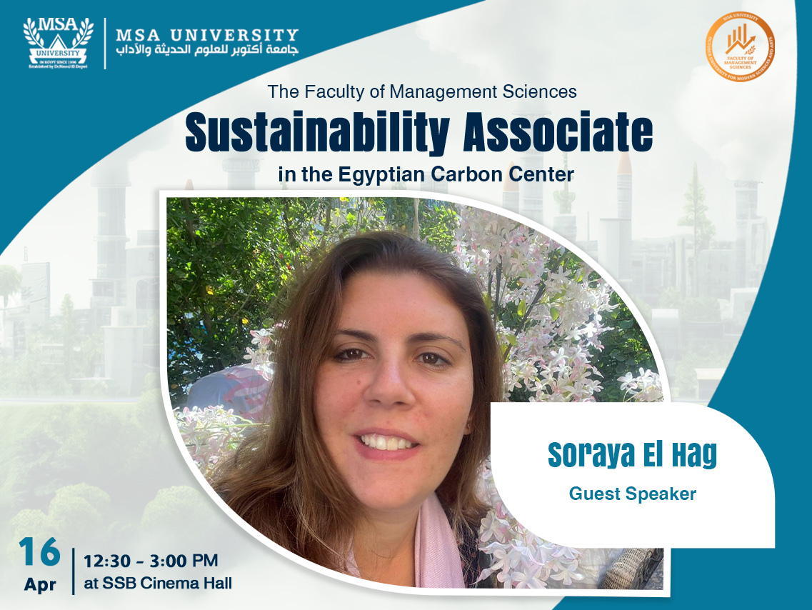 As part of its continuous commitment to bridging academic knowledge with real-world practices, the Faculty of Management Sciences at October University For Modern Sciences And Arts (MSA) is proud to host a thought-provoking event entitled “Sustainability Associate In the Egyptian carbon center” featuring Soraya El Hag, our expert guest speaker.