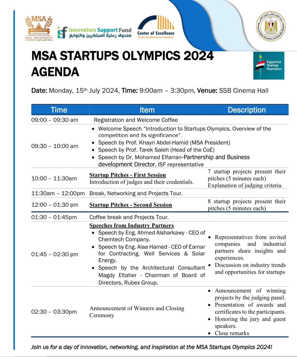 MSA University and the Center of Excellence, in partnership with the Innovators Support Fund (ISF) and under the supervision of the Ministry of Higher Education and Scientific Research, are delighted to invite you to attend the closing ceremony of the MSA Startups Olympics.