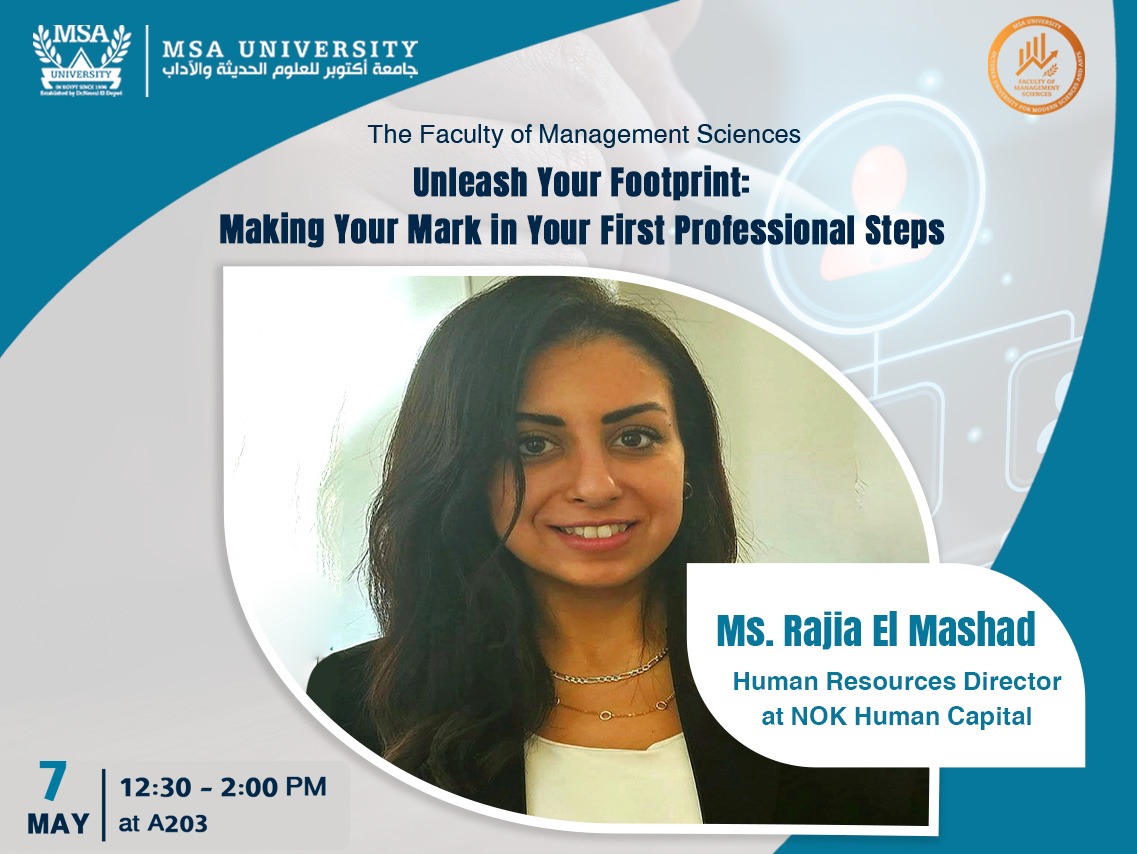 The Human Resources Management Department at the Faculty of Management Sciences at October University for Modern Sciences and Arts (MSA) is inviting you to attend a session entitled “Unleash Your Footprint: Making Your Mark in Your First Professional Steps” led by Ms. Rajia El Mashad, Human Resources Director at NOK Human Capital.