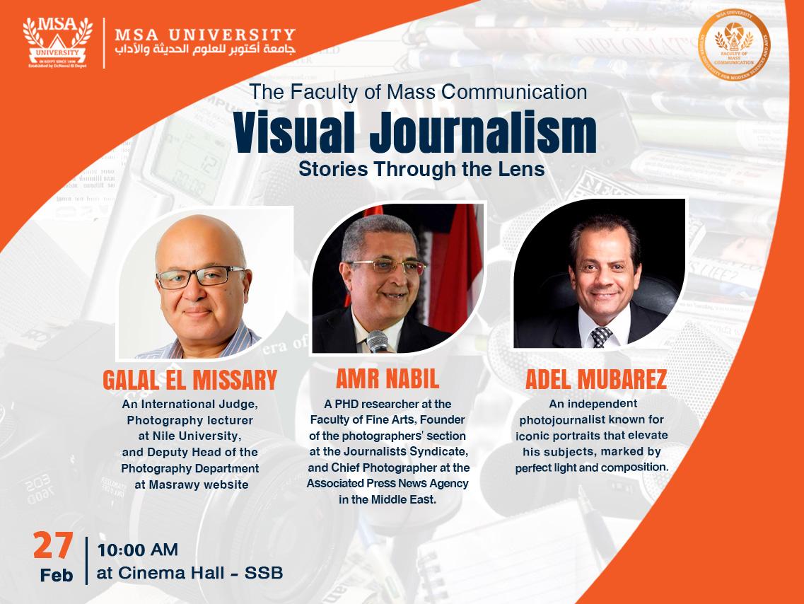 The Faculty of Mass Communication at October University for Modern Sciences and Arts (MSA) is thrilled to invite you to an exceptional event titled “Visual Journalism: Stories Through the Lens”, a celebration of the art of storytelling through visual media. This event will include an exclusive screening of student projects, showcasing the creativity, dedication, and talent of our rising visual journalists.