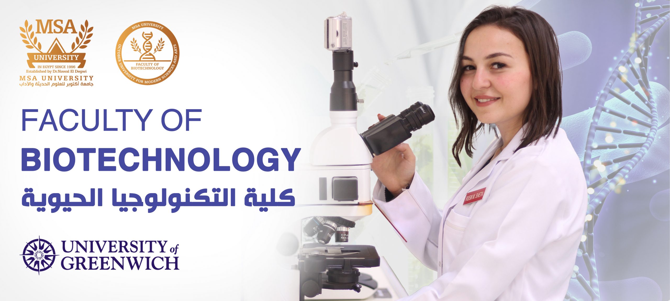 The Faculty of Biotechnology at October University for Modern Sciences and Arts (MSA) offers an outstanding educational programme, accredited nationally and internationally, using modern and advanced technological approaches, that supports entrepreneurship, thus qualifying competitive outstanding graduates who address the needs of labor market for all biotechnological fields. Furthermore, the faculty conducts applied scientific research, has prominent scientific publishing, contributes to distinguished community service, develops the competencies of its staff, and abides by national and international quality standards.