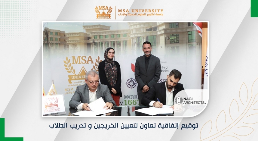 لتوفير فرص عمل متميزة للخريجين بكبرى الشركات والهيئات والمؤسسات المحلية والعالمية وبرامج تدريب متقدمة للطلاب وقع د. طارق صالح عميد كلية الفنون والتصميم إتفاقية تعاون مع شركة “ناجي المهندسين المعماريين ” المتخصصة فى الهندسة المعمارية والتصميم الداخلي بحضور م.احمد ناجي …