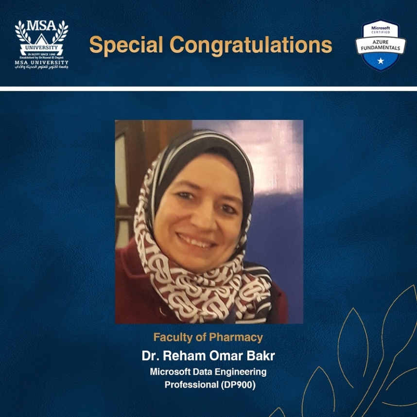 The University would like to congratulate Dr. Reham Omar Bakr, Faculty of Pharmacy, For Being the first certified Microsoft Data Engineering Professional (DP900).