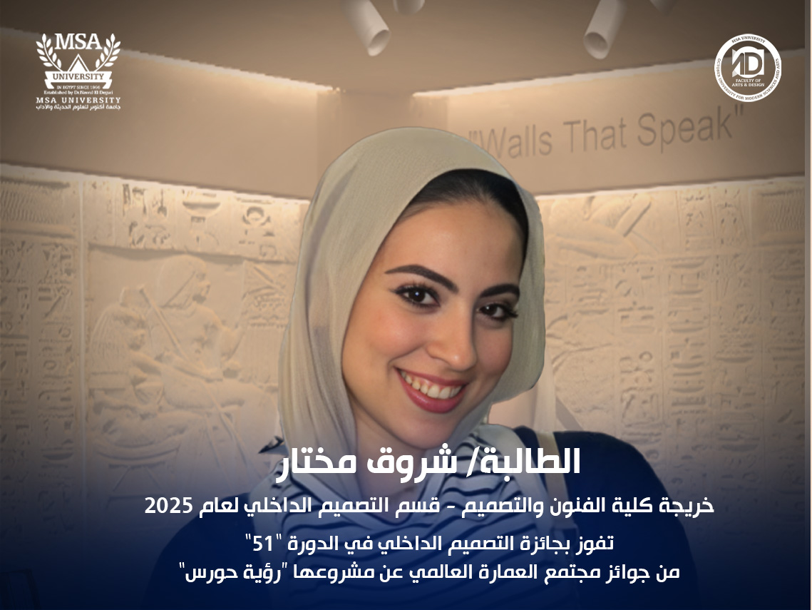 October University for Modern Sciences and Arts (MSA University) proudly congratulates Shorouk Mokhtar, an Interior Design student at the Faculty of Arts and Design, Class of 2025, for winning the Interior Design Award in the 51st Cycle of the World …