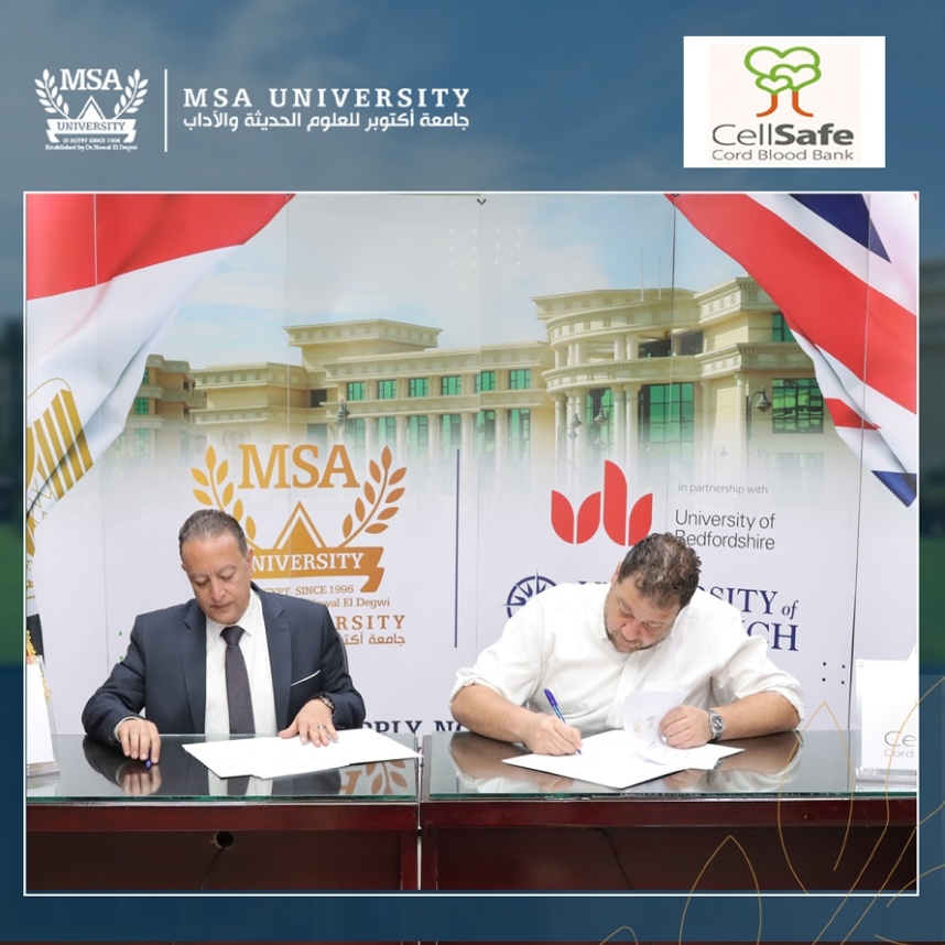 Due to the implementation of the strategic plan and future vision in employing our graduates in major local and international companies, and providing advanced training opportunities for our students in addition to implementing joint activities in university research and management consultancy,The Faculty of Biotechnology at October University for Modern Sciences and Arts (MSA University) signed a cooperation agreement with Cell Safe Bank, the first stem cell bank in Egypt and the Middle East