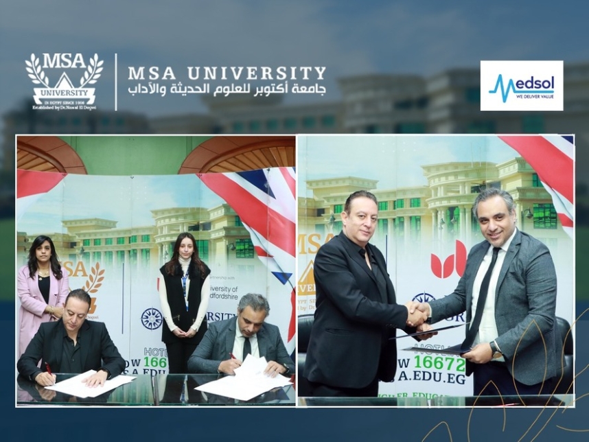 Dr. Ayman Diab, Dean of the Faculty of Biotechnology, signed a cooperation agreement with Medsol, a medical products and devices distributor in the presence of Ashour Abdel Latif, General Manager of Medsol.