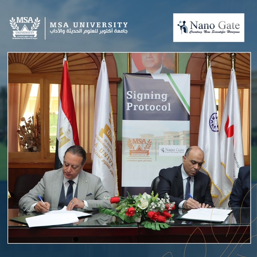 Due to the implementation of the strategic plan and future vision in employing our graduates in major local and international companies, and providing advanced training opportunities for our students in addition to implementing joint activities in university research and management consultancy, the Faculty of Biotechnology at October University for Modern Sciences and Arts (MSA University) signed a cooperation agreement with Nano Gate, a well-established firm that focuses on nanotechnology research and development, especially its relevance to the industry.