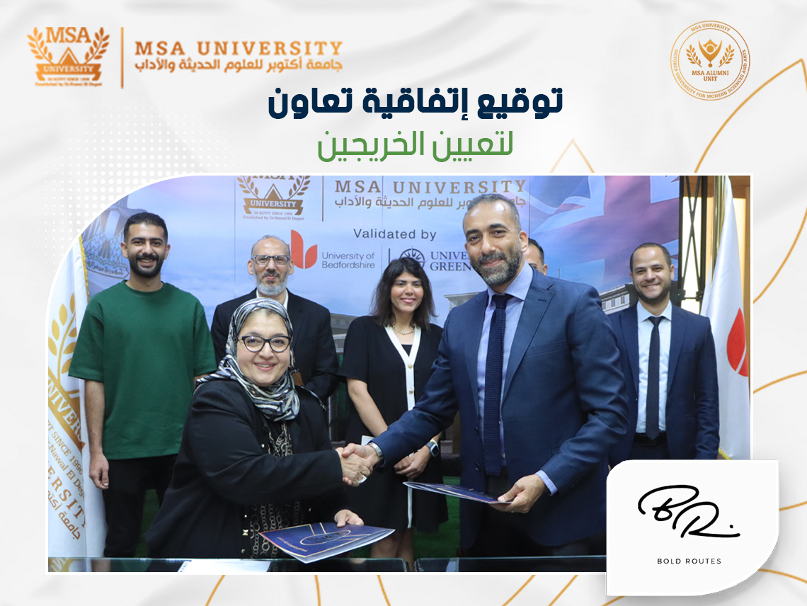 Dr. Hala El Marsafy, MSA Alumni Unit Director, signed a cooperation agreement with Bold Routes, a Real Estate company specialized in property sales, development, and investment consulting in the presence of Mr. Rady Ibrahim, Head of Business Development.