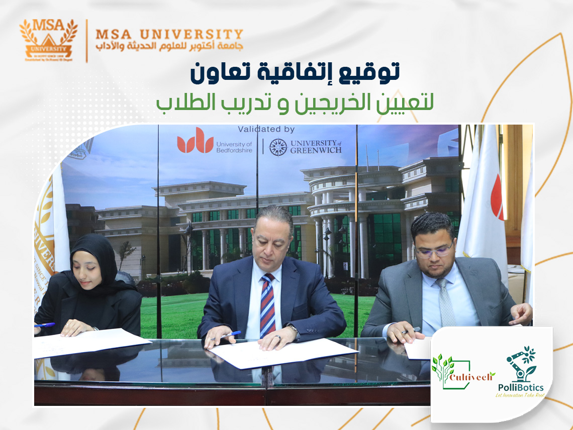 The signing was attended by Eng. Abdel Hamid El Deeb, Founder and CTO of Cultivech, and Ms. Norhan El Hefnawy, CEO of Pollibotics and a student at MSA University’s Faculty of Biotechnology.