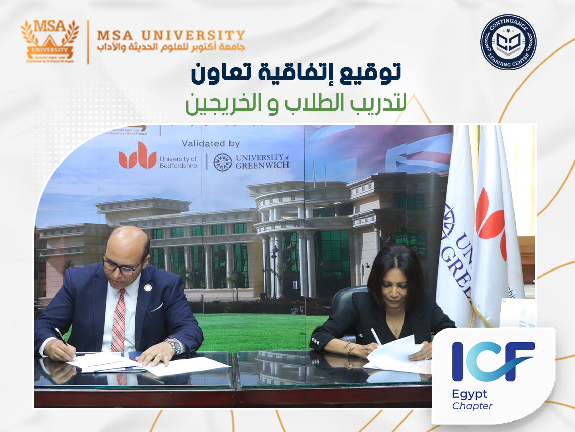 Mr. Ahmed Reda, Manager of the MSA Continuance Learning Center (MSA CLC), signed a cooperation agreement with ICF Egypt Chapter. The partnership aims to provide professional coaching and leadership development services to students, graduates, and faculty members in the presence of Chaïma Tayssir ICF Egypt Chapter – President.
