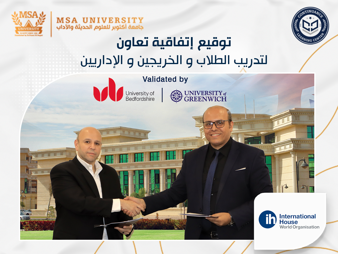 Mr. Ahmed Reda, Manager of the MSA Continuance Learning Center (MSA CLC), signed a cooperation agreement with International House Cairo (IH Cairo), a leading institution in language education and teacher training and is a part of the renowned International House World Organization, one of the largest and oldest networks of language schools worldwide, in the presence of the CEO Mr. Mohammed Attya, as a representative from the institution.