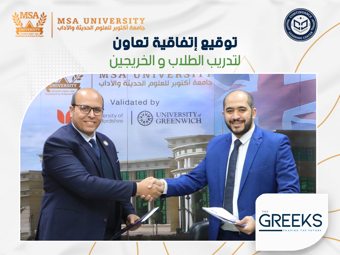 Mr. Ahmed Reda, Manager of the MSA Continuance Learning Center (MSA CLC), signed a cooperation agreement with the Greeks, a distinguished educational institution dedicated to preparing candidates for globally recognized certifications, including the CFA, CMA and more in the presence of Mr. Mohammed Badr, Managing Partner of The Greeks.