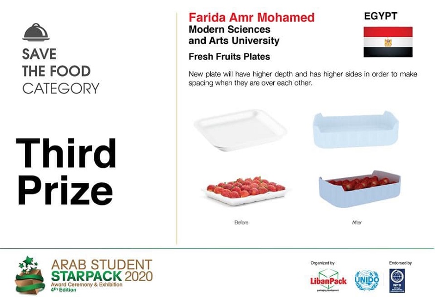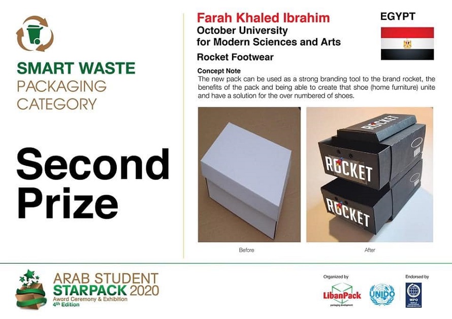 The competition falls within the packaging “awareness side of LibanPack” objective. The competition is accredited by World Packaging Organization. Moreover, Winners will automatically be qualified to participate in World Star competition organized by WPO, granting winning projects international visibility. The competition contains four main categories, which are visual packaging category, structural category, save the food category and smart waste category. The number of participates for this year were 460 participate from all the Middle East and the number of participates from Egypt was 216 participate. Our faculty of arts and design was submitted for 36 projects by 34 participate in all categories from the graphic and media arts department. The final results for the competition were announced by LibanPack Director and our students won 5 prizes from the competition in three categories. Firstly, Farah Khaled Ibrhim won by the second prize in the smart waste category in the Middle East. Secondly, we have two winners in the saving the food category that Nada Bakkar won by the first prize. And Farida Amr Mohamed won by the third prize. Finally, we have two winners also in the structural packaging category that Nouran Tarek Torky won by the second prize and Marian Magdy won by the third prize.