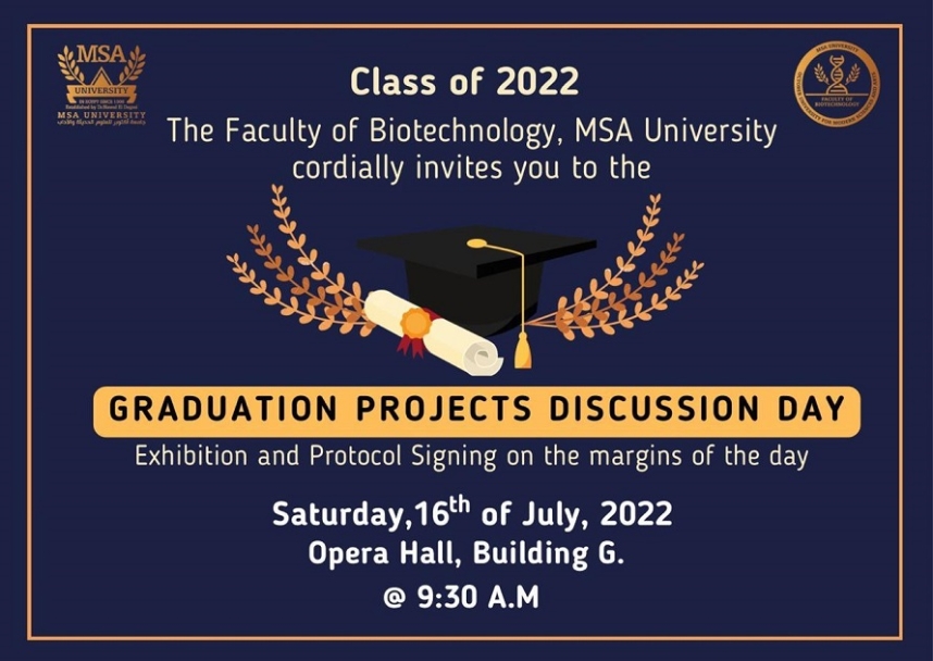The Faculty of Biotechnology, MSA University cordially invites you to attend the Graduation Projects Discussion Day (Class of 2022) on Saturday, 16th of July, 2022 at 09:30 am, Opera hall, Building G. On this day, the faculty presents its most …