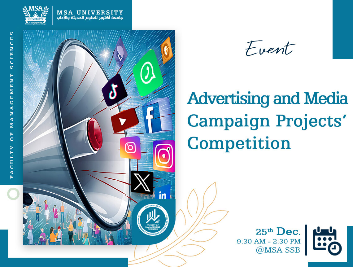 The Faculty of Management Sciences at October University for Modern Sciences and Arts (MSA University) invites you to attend the Advertising Projects competition for the Advertising and Media Campaign Module, Marketing and International Business program. The advertising projects’ competition is …