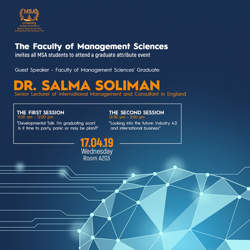 On 17th April 2019 (11am – 2pm) @ A203 The Faculty of Management Sciences invites all MSA students to attend a graduate attribute event. The guest speaker is Dr. Salma Soliman who is one of MSA University graduates. She …