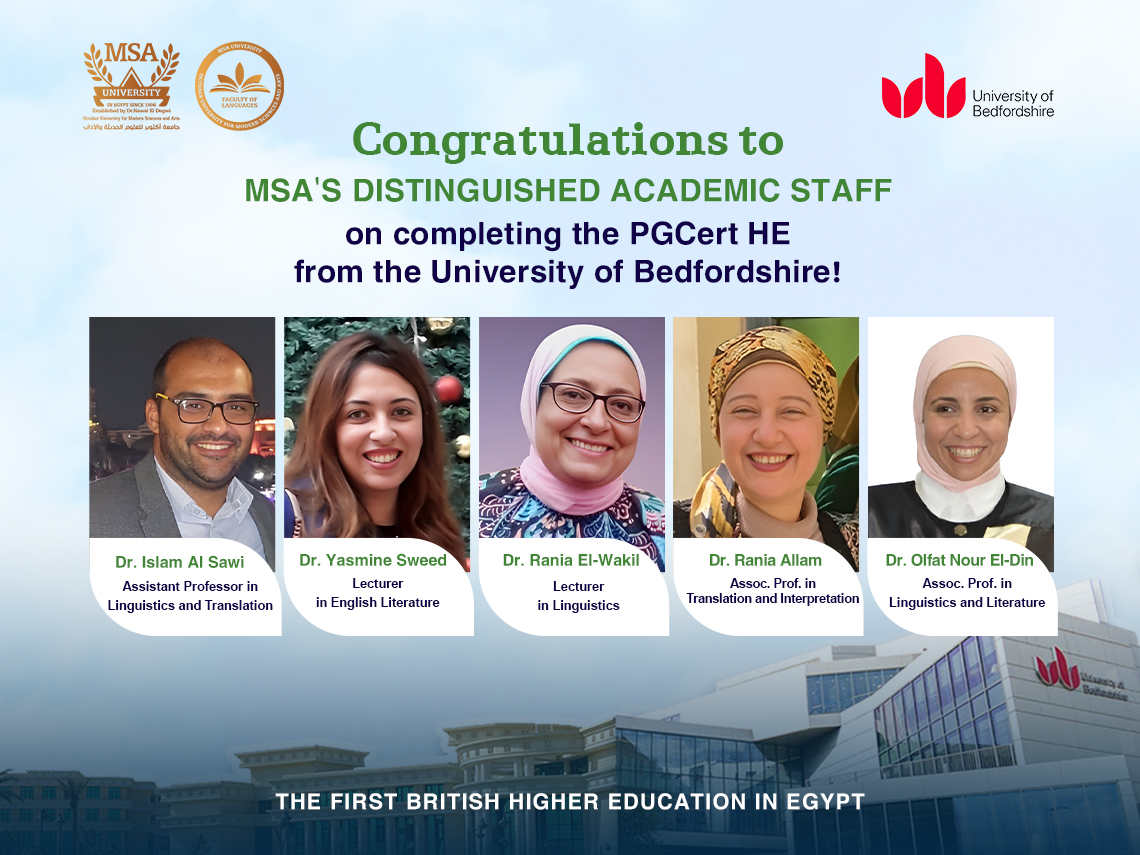 The Faculty of Languages at October University for Modern Sciences and Arts (MSA) proudly congratulates its distinguished academic staff members for successfully completing the Postgraduate Certificate in Higher Education (PGCert HE) – a prestigious UK-recognised qualification that strengthens teaching excellence, …