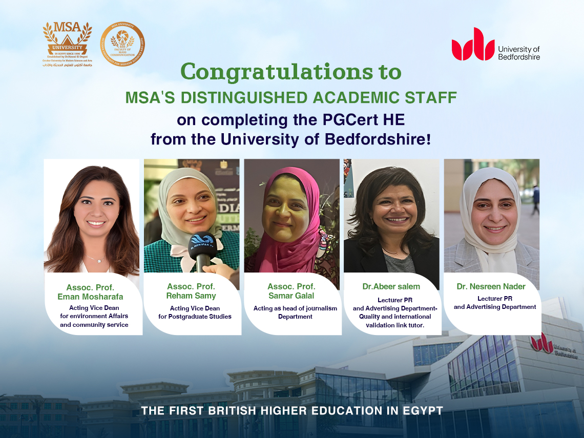 The Faculty of Mass Communication at October University for Modern Sciences and Arts (MSA) proudly congratulates its distinguished academic staff members for successfully completing the Postgraduate Certificate in Higher Education (PGCert HE) – a prestigious UK-recognised qualification that strengthens teaching …